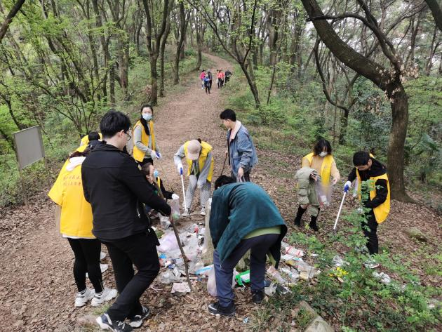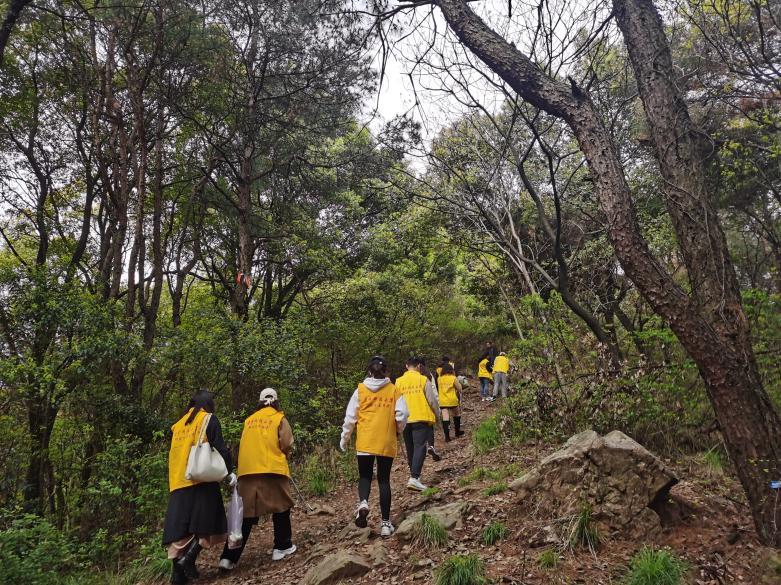 在登山過程中,志愿者們仔細(xì)查看周邊地面環(huán)境,兩兩一組尋找并撿拾沿途道路上的垃圾,在郁郁蔥翠的喻家山林中穿行著明亮的志愿者馬甲黃,構(gòu)成一道別樣的風(fēng)景。