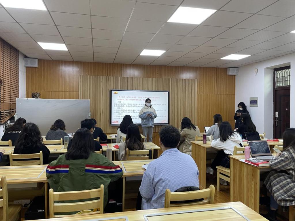 第二部分是《習(xí)近平的七年知青歲月》讀書收獲匯報。各支部預(yù)備黨員同志以小組為單位進行讀書交流,分別依據(jù)知青說、村民說、各界說中的內(nèi)容,談感想感悟、談黨性修養(yǎng)、談自身發(fā)展。首先,2021級第一黨支部代表毛明鳳同志結(jié)合書中總書記辦沼氣等具體事例,介紹了總書記在梁家河插隊時期村民對總書記的高度評價,體現(xiàn)了總書記吃苦耐勞、全心全意為人民服務(wù)的優(yōu)良精神。