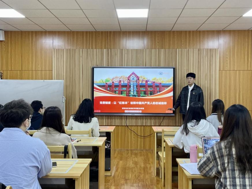 本次活動共分為三個部分。第一部分是微黨課學(xué)習(xí)。由研究生紅色理論學(xué)講團講師、馬克思主義學(xué)院2020級碩士生第一黨支部書記張澤民帶來“黨費制度:以‘紅賬本’詮釋中國共產(chǎn)黨人的忠誠信仰”主題微黨課,按照時間順序向大家講解了從新民主主義革命時期、社會主義革命與建設(shè)時期、改革開放與社會主義現(xiàn)代化建設(shè)時期到中國特色社會主義新時代黨費制度由初創(chuàng)、探索、發(fā)展到系統(tǒng)化、科學(xué)化的日益完善的發(fā)展歷程。最后他闡述了黨費的意義:“交納黨費是黨員對黨組織的忠誠信仰和期盼,是黨員不忘初心的身份認(rèn)同,是全面從嚴(yán)治黨的重要環(huán)節(jié)。作為黨員,我們要強化黨員黨章意識和組織觀念,提醒自己是黨組織的一員,要為組織盡義務(wù),要承擔(dān)黨的責(zé)任。做合格黨員,從主動、按時、足額交納黨費開始。”