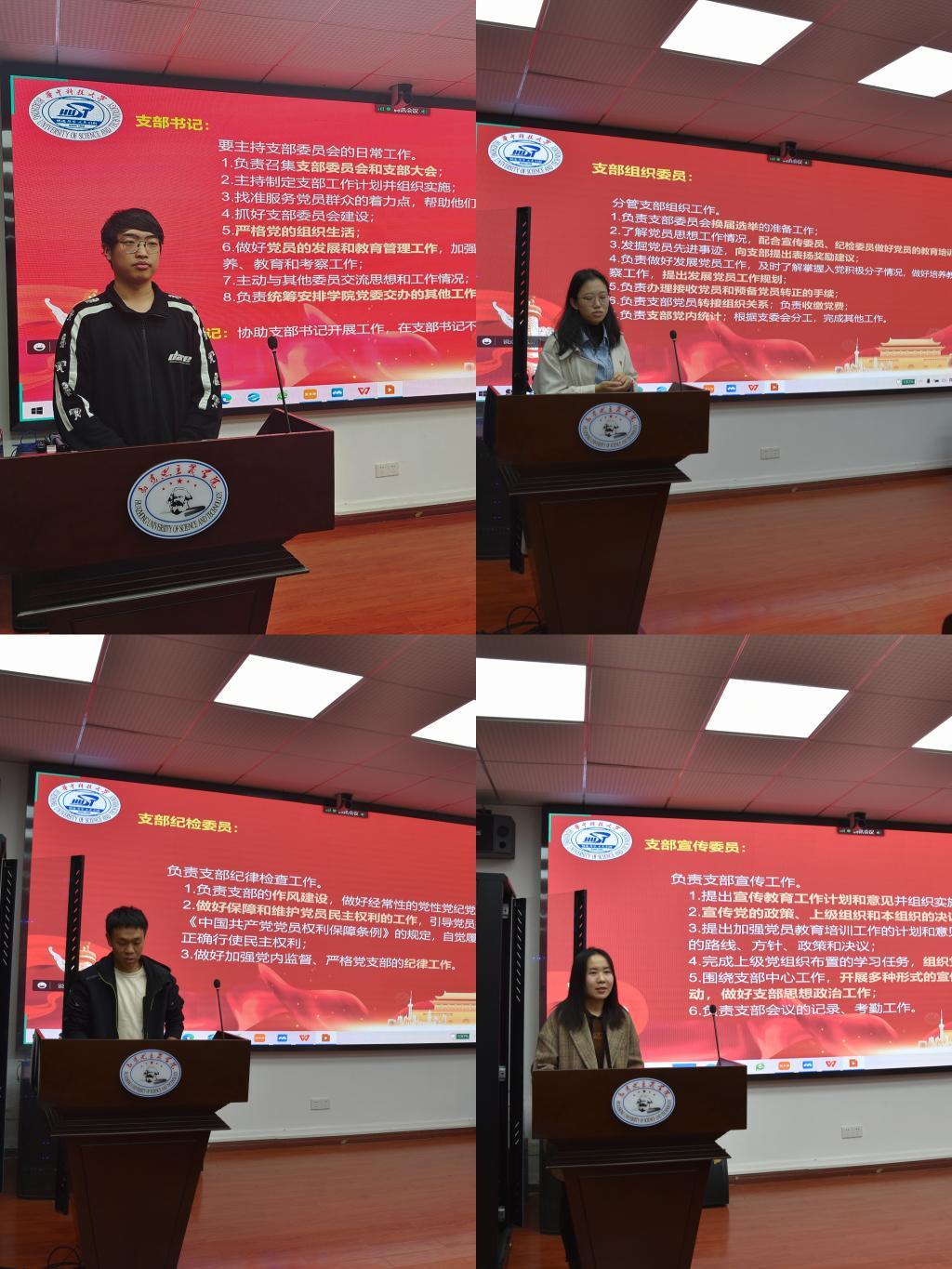 接下來(lái),由黨支部書記毛明鳳同志介紹碩士生馬克思主義中國(guó)化研究黨支部的基本構(gòu)成及支委會(huì)成員情況。她指出,縱向黨支部正式成立以來(lái)各年級(jí)同志互相還不太熟悉,首先要讓大家從認(rèn)識(shí)支委成員開始增進(jìn)交流,讓“有問題找支部”這句話落到實(shí)處。隨后,黨支部副書記陳澤宇同志、組織委員李若楠同志、紀(jì)檢委員吳鑫毅同志、宣傳委員劉之琳同志依次上臺(tái)進(jìn)行自我介紹,并向大家闡述自己的工作職責(zé)。這也讓大家對(duì)縱向黨支部的基本情況和支委會(huì)成員有了進(jìn)一步的了解。