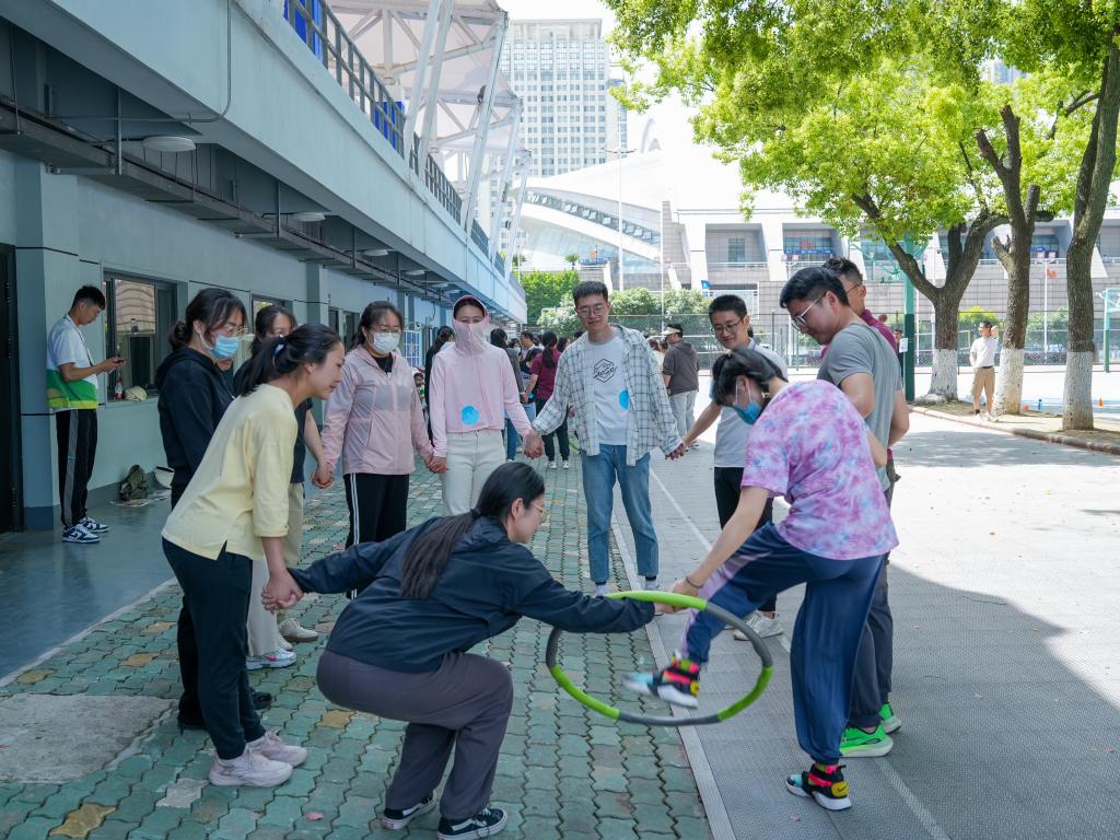 環(huán)環(huán)相扣,一圈到底。一圈到底比賽開始,隊員們迅速利用手臂的力量將呼啦圈甩起,旁邊的隊友微微屈膝,呼啦圈就從頭頂直落到腰際。銜接處的每一次傳遞,一環(huán)扣一環(huán)的流暢過程,不僅需要個人的肢體柔韌度,也考驗著隊友間的協(xié)調(diào)配合能力。