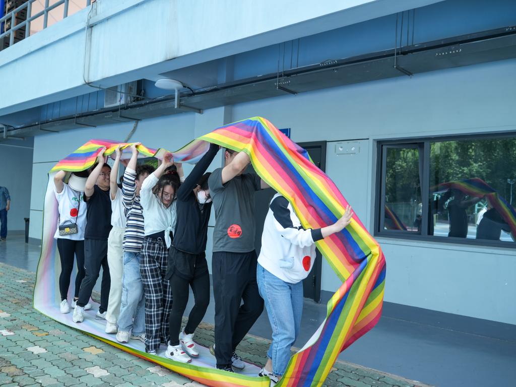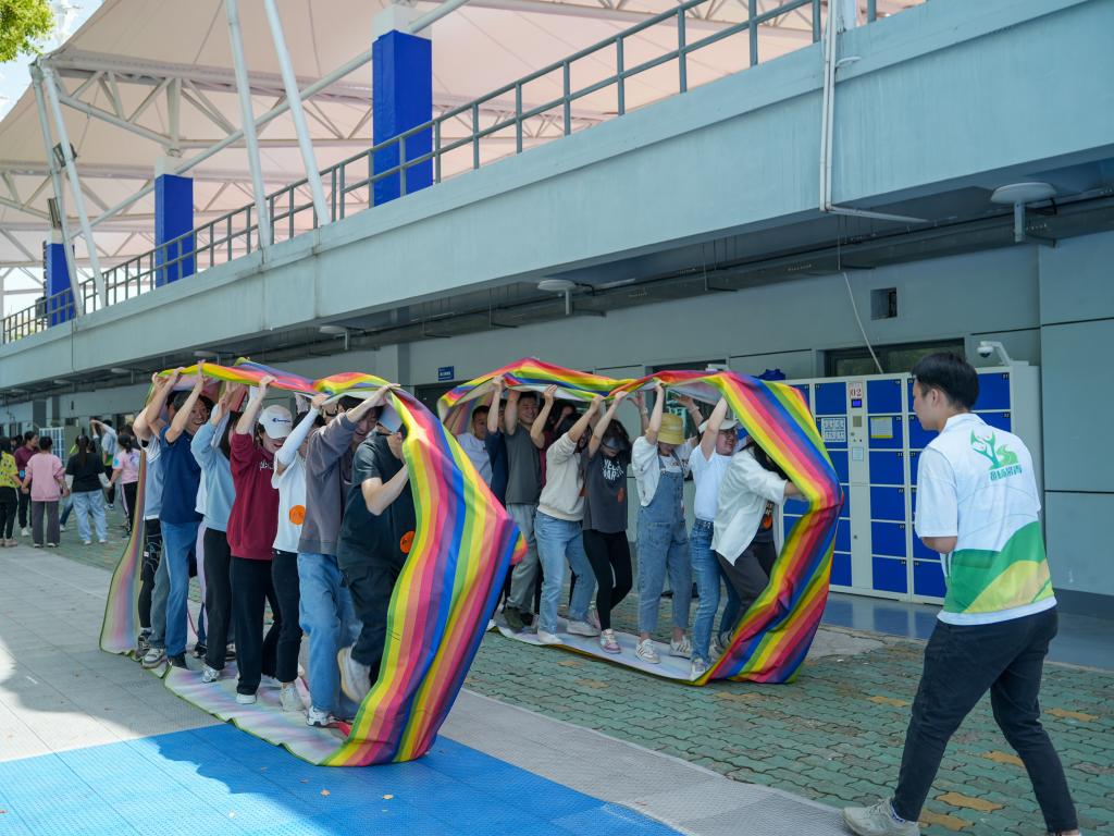 同舟共濟(jì),密切合作。隊員們站進(jìn)彩色的履帶中,步調(diào)一致向前行進(jìn),在洪亮整齊的口號聲中,履帶成功將小隊所有成員運(yùn)送至終點。老師同學(xué)們相互配合,團(tuán)結(jié)一致,為了共同的終點線而前進(jìn)。