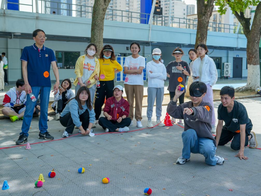 沙場之上,兩軍對壘。“指揮官”在場外指揮蒙眼的“士兵”在躲避“地雷”的同時準(zhǔn)確找到沙包,擊中對手。這不僅考驗了“士兵們”的反應(yīng)能力和躲閃能力,也充分展現(xiàn)了“指揮官們”冷靜沉著的頭腦和團(tuán)隊配合的默契。