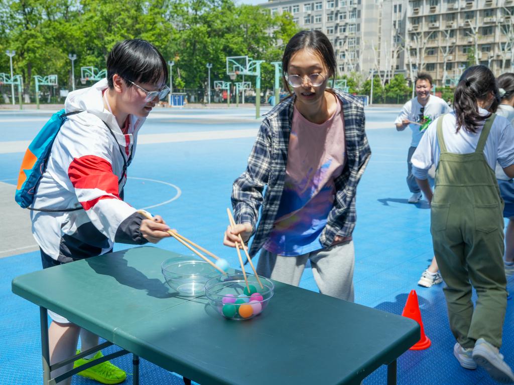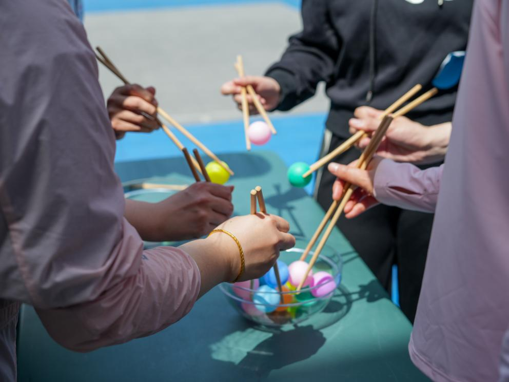 跨越阻礙,爭分奪秒。在限定的時間內(nèi),隊員們用筷子夾緊乒乓球,靈活地繞過障礙物,又穩(wěn)又快,將乒乓球安全運(yùn)送到對面的碗中。