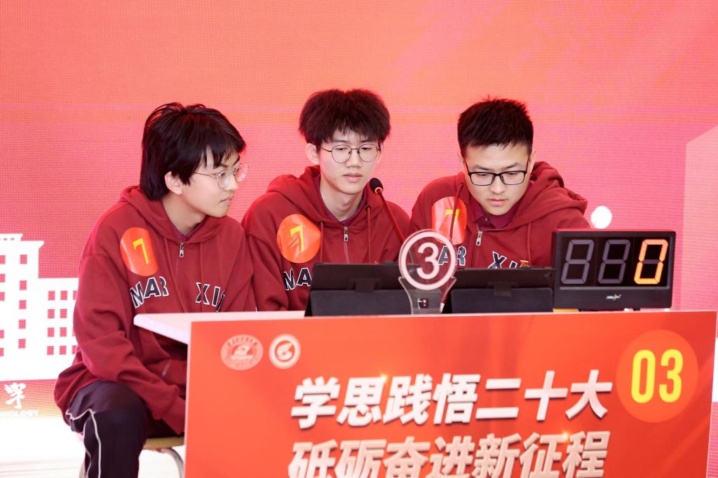 決賽共設(shè)置“齊頭并進(jìn)”“狹路相逢”“巔峰對決”三輪比拼環(huán)節(jié)。兩支隊(duì)伍沉著應(yīng)戰(zhàn)、團(tuán)結(jié)協(xié)作,展現(xiàn)出過硬的理論素養(yǎng)和豐富的知識儲備。在對抗賽環(huán)節(jié),“極目楚天隊(duì)”在落后3分的情況下奮起直追,最終獲勝;在搶答賽環(huán)節(jié),隊(duì)員們聚精會神聽題、搶抓機(jī)會答題,最終取得了優(yōu)異成績。