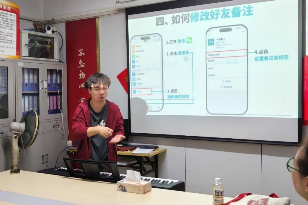 微信是老年人生活中最重要的應(yīng)用程序。為解決老年人看不清手機(jī)文字的難題,志愿者首先著重講解了微信內(nèi)調(diào)大字體的操作,進(jìn)而詳細(xì)解釋了微信添加好友、推薦好友、發(fā)送語音消息、撥打語音、視頻通話等基礎(chǔ)功能。老年人們認(rèn)真聽講,積極參與,志愿者從旁協(xié)助,并針對老人提出的問題逐一進(jìn)行解答,確保其掌握微信使用技巧。