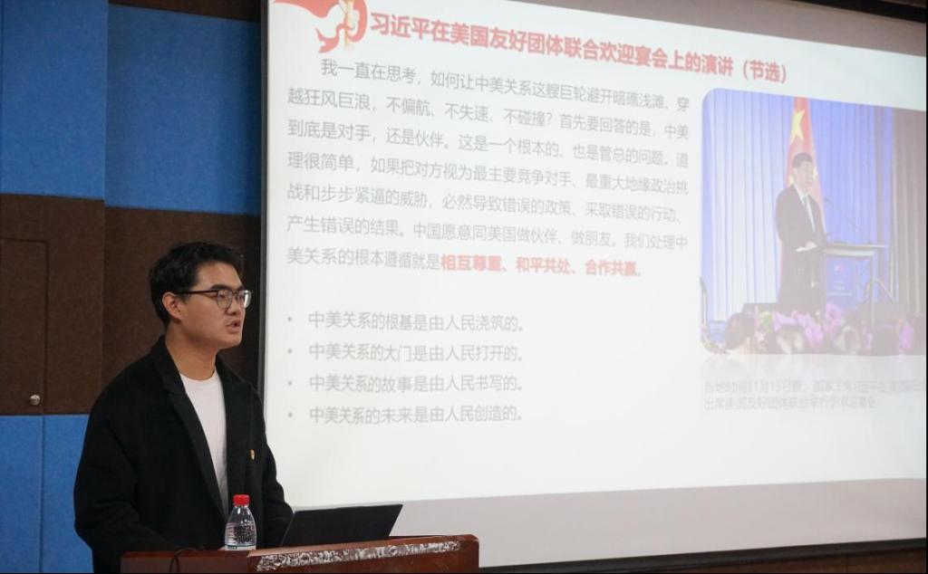 最后,由黨的建設(shè)專(zhuān)業(yè)碩士生黨支部章和毅同志就習(xí)近平在美國(guó)友好團(tuán)體聯(lián)合歡迎宴會(huì)上的演講內(nèi)容進(jìn)行分享。他結(jié)合歷史故事和理論研究,闡述總書(shū)記關(guān)于處理中美關(guān)系“相互尊重、和平共處、合作共贏”的根本遵循,從以人民為中心的視角,解讀“人類(lèi)命運(yùn)共同體”和“走和平發(fā)展道路的中國(guó)式現(xiàn)代化”的深刻內(nèi)涵,鼓勵(lì)全體同學(xué)關(guān)心時(shí)政熱點(diǎn),系統(tǒng)、全面學(xué)習(xí)習(xí)近平外交思想。