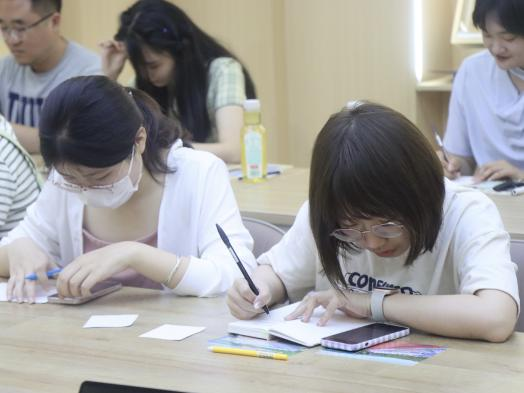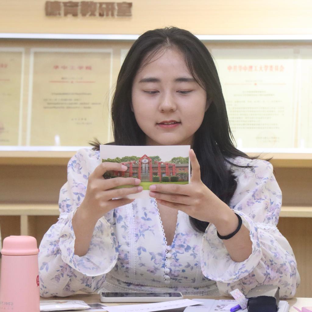 會議伊始,畢業(yè)生領(lǐng)取明信片,紛紛寫下對一年后對自己、同學(xué)、學(xué)院、學(xué)校的寄語。