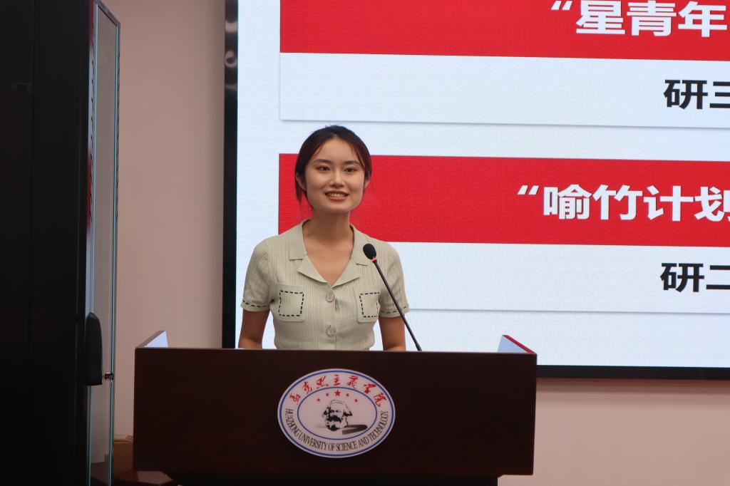 2021級碩士研究生毛明鳳從江蘇常州武進區(qū)的個人實習(xí)經(jīng)歷出發(fā),對學(xué)校“星青年”工程作詳細介紹。她從日常工作、食宿安排、基本流程等方面進行了分享,并現(xiàn)場展示了實習(xí)期間的相關(guān)照片及紀念品。她表示,“星青年”政務(wù)實習(xí)是自己人生中一段極其珍貴的經(jīng)歷,不僅提升了自身工作本領(lǐng),還結(jié)識了眾多志同道合的朋友。