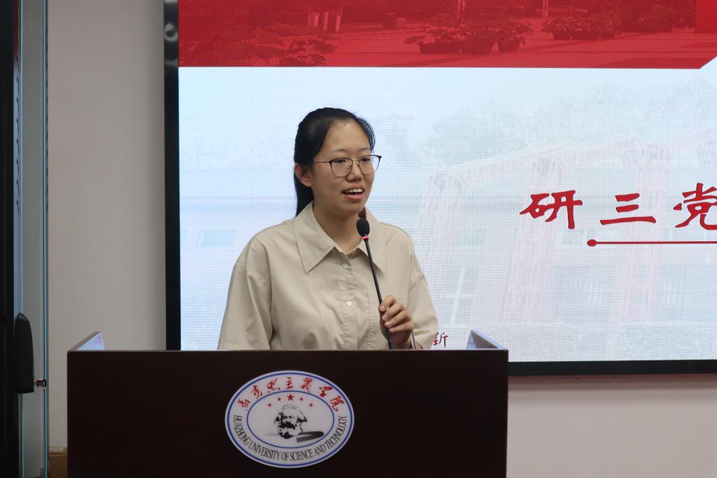 研三黨小組組長李若楠代表支部2024屆畢業(yè)生黨員作交流發(fā)言。她聯(lián)系工作和生活實際,分享了在工作中保持初心、在實踐中錘煉黨性、在服務(wù)中踐行宗旨的體會和感悟,并表明自己將站好最后一班崗,完成畢業(yè)生黨員組織關(guān)系轉(zhuǎn)接等支部工作安排。