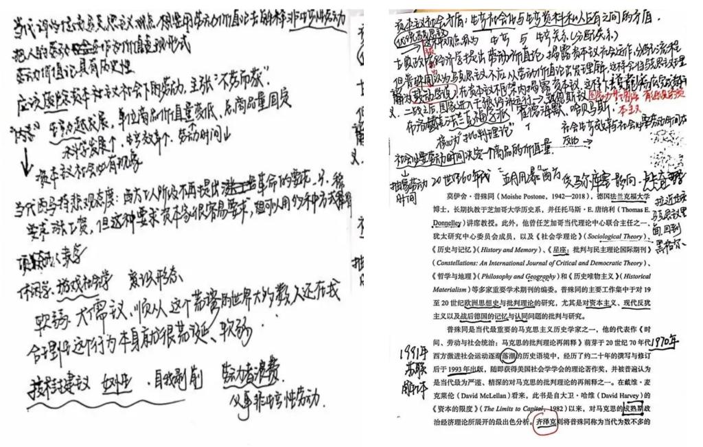 在導(dǎo)讀過程中,蔡超老師和同學(xué)們共同探討了傳統(tǒng)馬克思主義中生產(chǎn)力與生產(chǎn)關(guān)系、經(jīng)濟(jì)基礎(chǔ)與上層建筑的理論框架,借用“跑步機(jī)效應(yīng)”的概念,闡明了文中提出的觀點(diǎn)——即在勞動(dòng)者生產(chǎn)力不斷提高的情況下,其勞動(dòng)價(jià)值卻相對(duì)降低的悖論。蔡超進(jìn)一步指出,普殊同在本書中批判了將勞動(dòng)價(jià)值抽象化的思維方式,并和同學(xué)們一起探討了當(dāng)代西方國家工人階級(jí)不再積極爭取革命性變革的深層原因。
