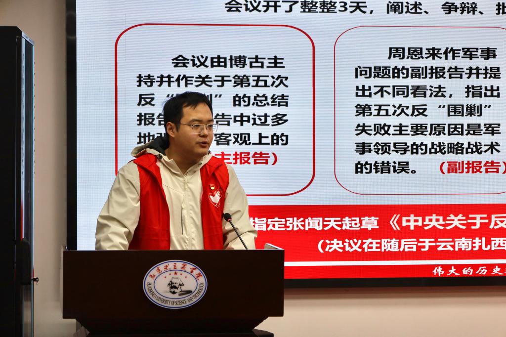 會議第二項議程是特邀研究生青馬班遵義會議精神志愿宣講團進行授課。宣講團成員楊一博以生動的案例、詳實的資料和深刻的理解,向與會師生詳細(xì)闡述了遵義會議的歷史背景、歷史過程、主要內(nèi)容、歷史意義和精神內(nèi)涵。通過授課,大家更加深入地了解了黨的光輝歷程和革命精神,也進一步堅定了理想信念,增強了責(zé)任感和使命感。