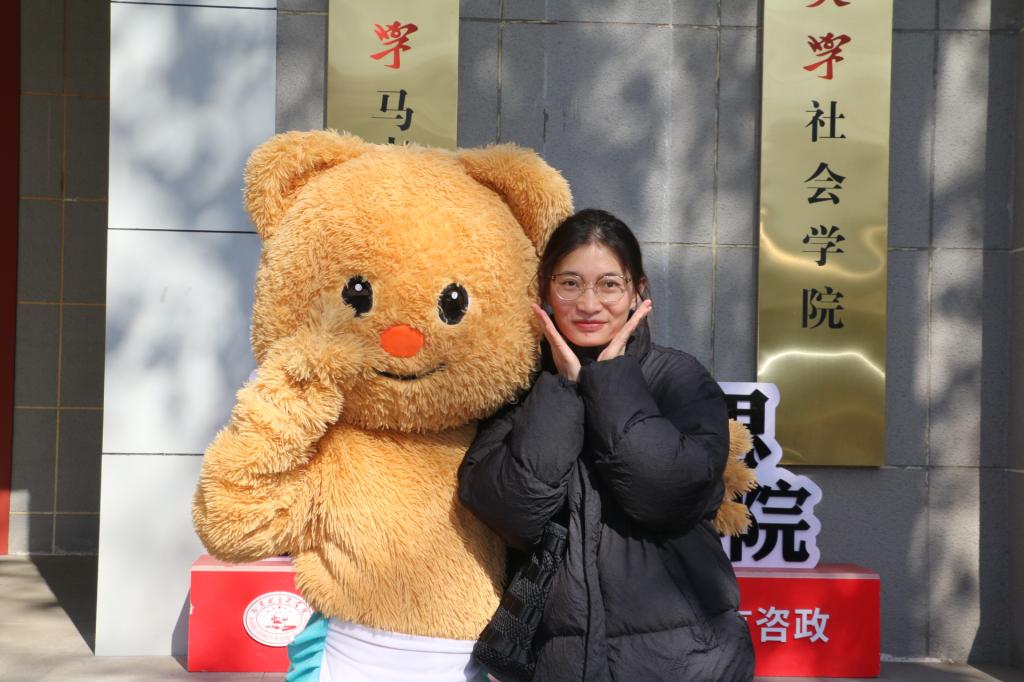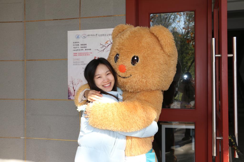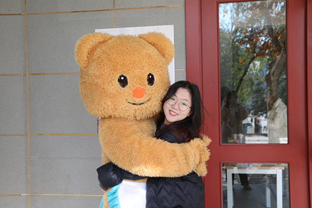 工作人員身穿黃油小熊人偶服,成為活動現(xiàn)場最受歡迎的“溫暖使者”。同學(xué)們熱情地與黃油小熊擁抱合影,用照片定格了這些溫暖瞬間。從上午到傍晚,這個小小的“擁抱站”收獲了無數(shù)溫暖瞬間和燦爛笑容。