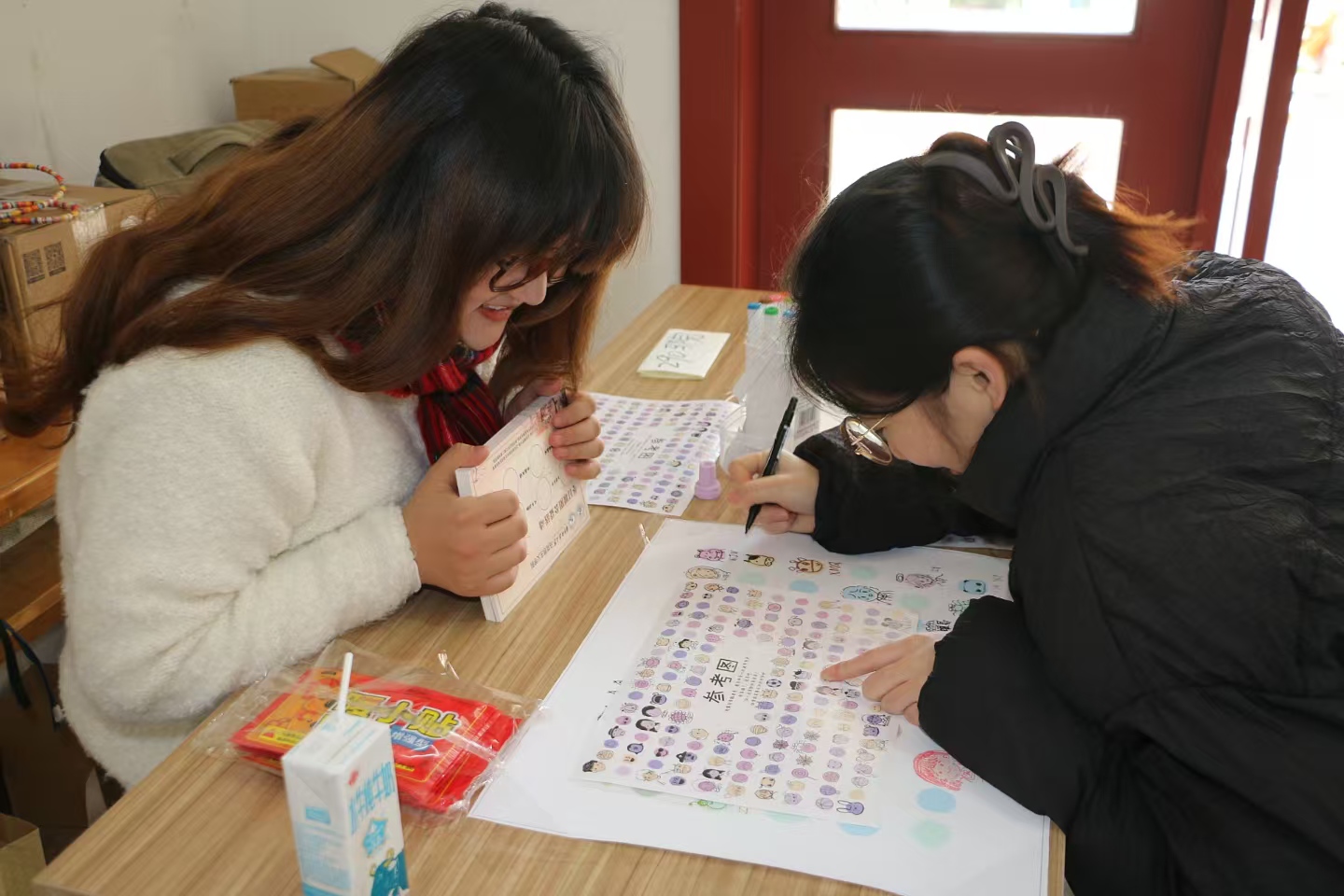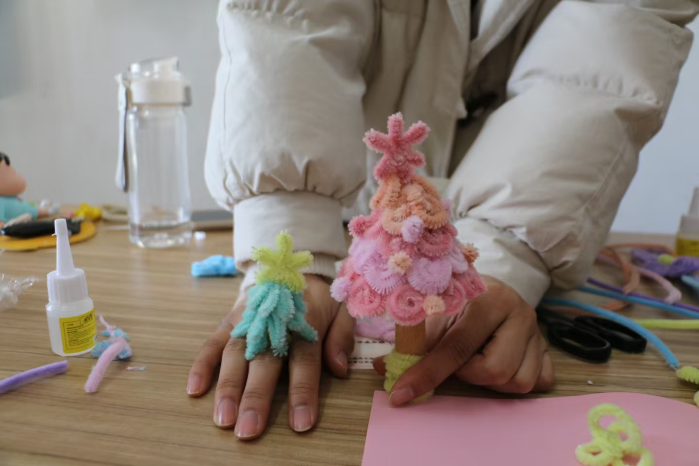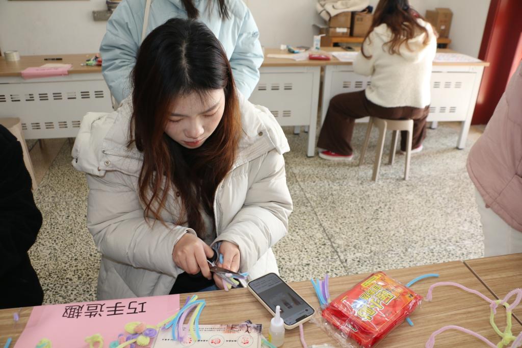 在DIY區(qū)域,同學(xué)們認(rèn)真挑選材料,專注創(chuàng)作。扭扭棒在靈巧的雙手中成為可愛的眼鏡、溫暖的太陽、漂亮的小花等,還有同學(xué)用不織布制作精美的小物件。志愿者們將這些作品進(jìn)行展示并悉心保存,使這份心意得以在時光中永駐。