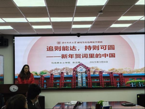 會議伊始,研究生紅色理論宣講團講師張潔雅帶來了微黨課“追則能達,持則可圓——新年賀詞里的中國”。張潔雅深入解讀了習近平總書記的新年賀詞,介紹了新年賀詞的起源與發(fā)展,生動講出了歷代賀詞中的時代強音與家國情懷,使支部成員深刻領略到國家發(fā)展的脈搏與方向,感受到賀詞中所蘊含的深厚情感與堅定信念。