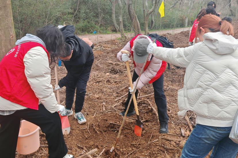 在種植現(xiàn)場,志愿者們三至四人為一組,分工明確,默契配合,扶苗、栽樹、培土、踩實……每個步驟都有條不紊,汗水浸潤著土地,笑聲回蕩在森林公園。經過1個多小時的協(xié)作,志愿者們共同栽下了承載著希望的11棵樸樹苗和2棵樟樹苗。一棵棵樹苗迎風挺立,生機勃勃,為大地添綠增彩。