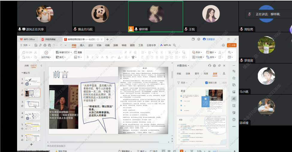 喻文婷就武漢示范性招聘進(jìn)行了詳細(xì)介紹。她指出,在求職前要綜合考慮自己的偏重,明晰主次;在求職中要找準(zhǔn)定位,發(fā)揮自我優(yōu)勢。隨后,她就武漢示范性招聘的報(bào)名、結(jié)構(gòu)化面試、試講等各個(gè)流程進(jìn)行了細(xì)致講解,并表示不斷“修行”,久久為功,一定可以達(dá)成所愿。