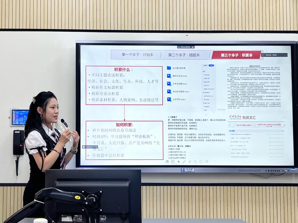 隨后,應(yīng)銳雪、李小君、賈才鵬和李語譞依次結(jié)合自身經(jīng)歷,詳細(xì)講解了各自的備考過程與擇崗方法,在場同學(xué)們紛紛表示受益匪淺。應(yīng)銳雪以三個(gè)階段、三個(gè)本子、三個(gè)平衡為切入點(diǎn),系統(tǒng)梳理了備考的注意事項(xiàng),幫助同學(xué)們對備考知識形成了全面系統(tǒng)的了解。李小君就個(gè)人選調(diào)情況、各省份需求現(xiàn)狀詳細(xì)分享了自己的經(jīng)驗(yàn),使同學(xué)們對各個(gè)地區(qū)選調(diào)的優(yōu)缺點(diǎn)有了初步的認(rèn)識。賈才鵬圍繞自己的備考思路和重要經(jīng)驗(yàn)展開講解,給在場的同學(xué)們分享了他考公上岸的秘籍,并建議同學(xué)們要做好取舍、保持好心態(tài),堅(jiān)持到最后。李語譞就“決策和計(jì)劃”進(jìn)行梳理,從宏觀的角度解答了同學(xué)們心中的疑惑,分享了自己在選擇崗位時(shí)的考慮和想法,其中最重要的是明確自己想要什么,并要為之制定計(jì)劃、付諸行動。