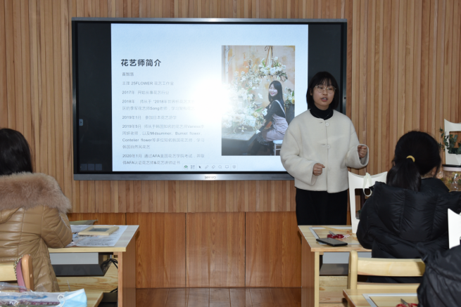 隨后,花藝?yán)蠋煆幕ㄋ囎髌方榻B、作品整體形態(tài)、花材的分類認(rèn)識、實用的花藝小技巧四個方面為全體女教師介紹了永生花的制作以及鮮花的搭配技巧。