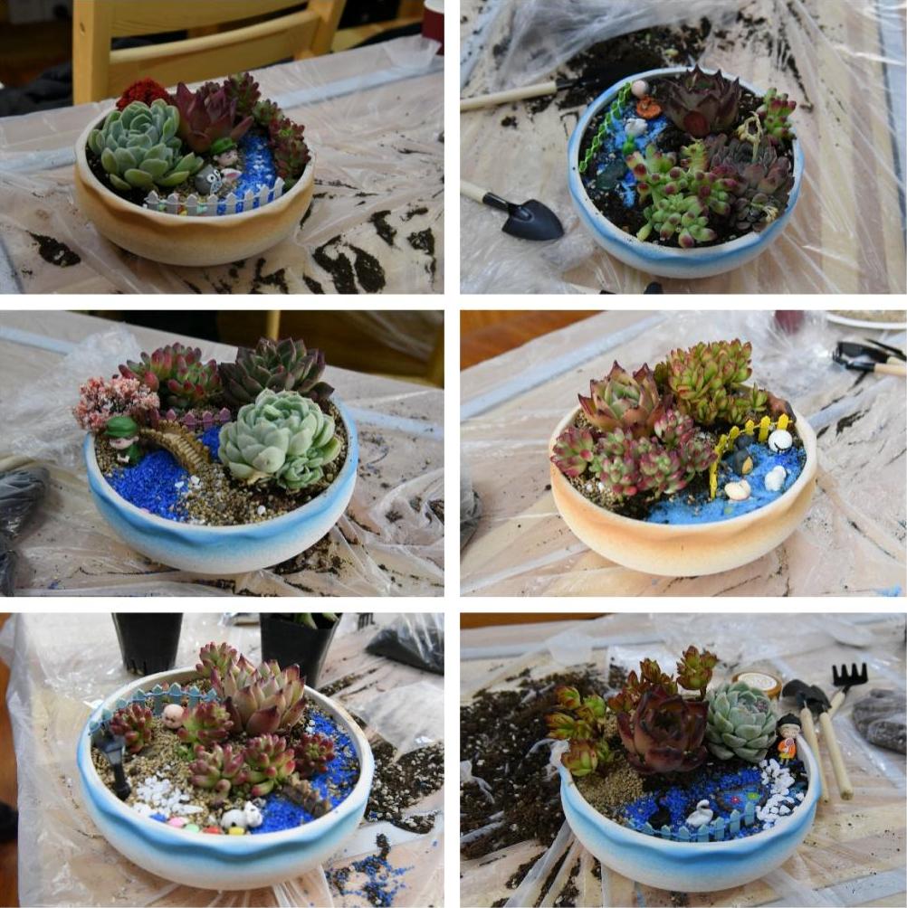 活動在歡聲笑語中拉開序幕,在專業(yè)老師的指導下,老師們認真學習如何選盆、如何布局以及土的厚度、如何養(yǎng)護等。聽著專業(yè)老師的娓娓道來,老師們躍躍欲試,紛紛拿起多肉饒有趣味地種植著。大家在動手制作的過程中展示出豐富的創(chuàng)造力,打造出各具特色的“純手工盆景”,感受種植栽培的樂趣。