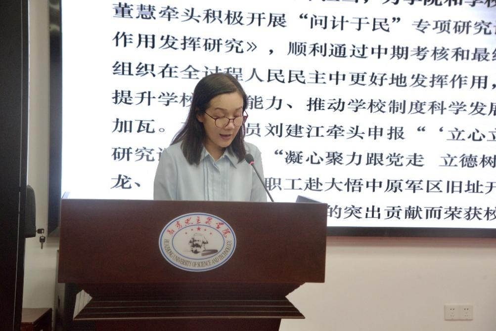 全體會(huì)議開始前,學(xué)院工會(huì)主席董慧主持召開主席團(tuán)會(huì)議。會(huì)議討論了教代會(huì)成員增補(bǔ)情況,主席團(tuán)成員通過舉手表決一致同意增列劉雅然同志為教代會(huì)成員。
