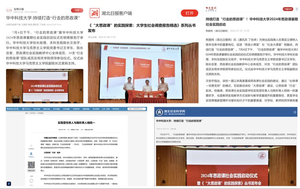 (通訊員:趙姍琳)近年來(lái),華中科技大學(xué)創(chuàng)新思政課教育模式,將課堂從校園延伸至社會(huì),促進(jìn)“思政小課堂”與“社會(huì)大課堂”相融合,推出“行走的思政課”社會(huì)實(shí)踐項(xiàng)目。通過(guò)社會(huì)實(shí)踐,不僅激發(fā)了大學(xué)生對(duì)思政課程的興趣和熱情,還深化了他們對(duì)黨情國(guó)情社情民情的理解與認(rèn)同。目前,華中科技大學(xué)馬克思主義學(xué)院聯(lián)合相關(guān)部門(mén)召開(kāi)2024年思政課社會(huì)實(shí)踐啟動(dòng)儀式暨《“大思政課”的實(shí)踐探索:大學(xué)生社會(huì)調(diào)查報(bào)告精選》新書(shū)發(fā)布活動(dòng),獲得了《光明日?qǐng)?bào)》、《湖北日?qǐng)?bào)》、中國(guó)社會(huì)科學(xué)網(wǎng)、湖北社會(huì)科學(xué)網(wǎng)、荊楚網(wǎng)等多家主流媒體的高度關(guān)注和廣泛報(bào)道。